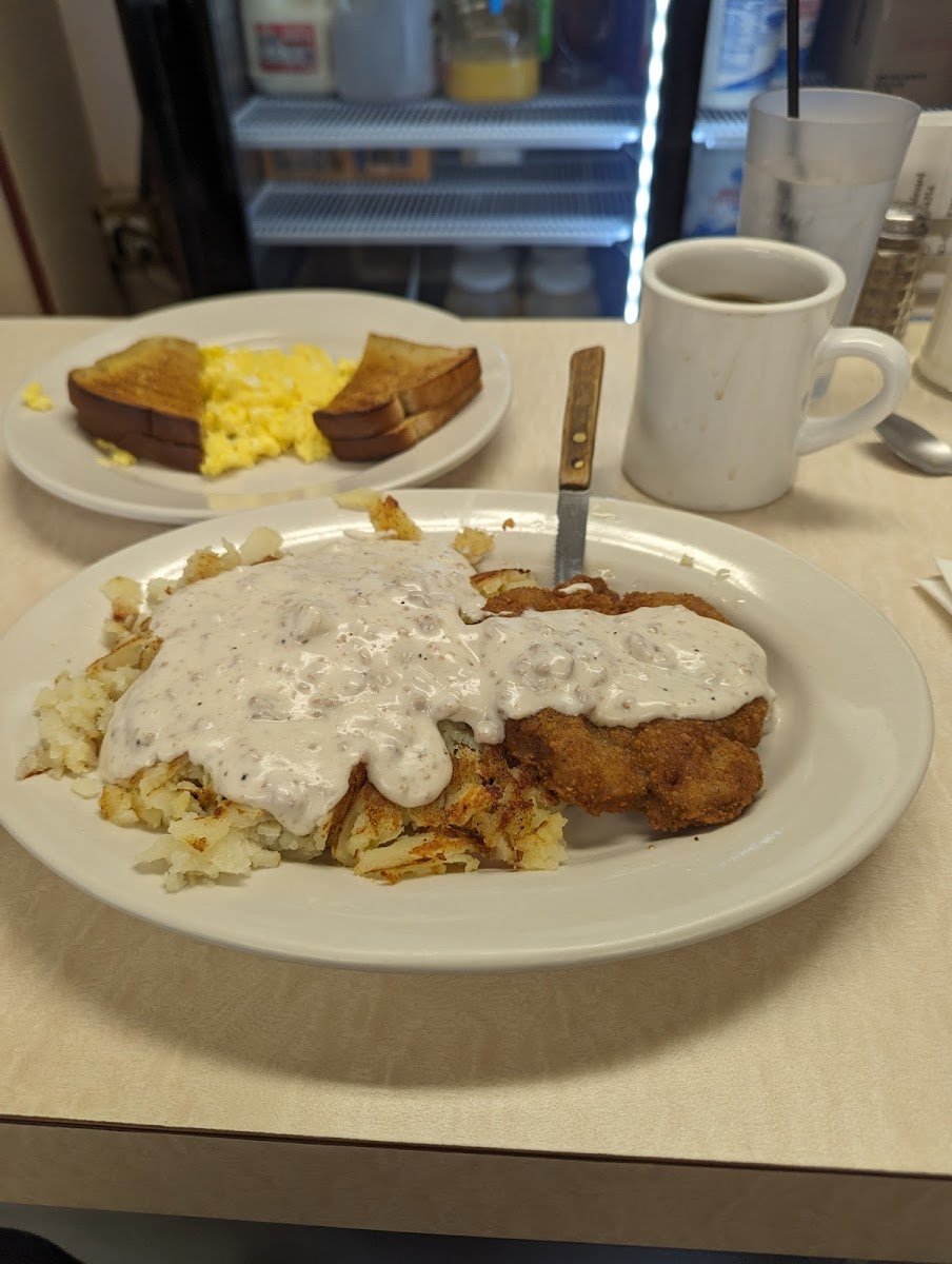 Had the country fried steak with sausage gravy. It was very good. Nice little diner. Cash only.