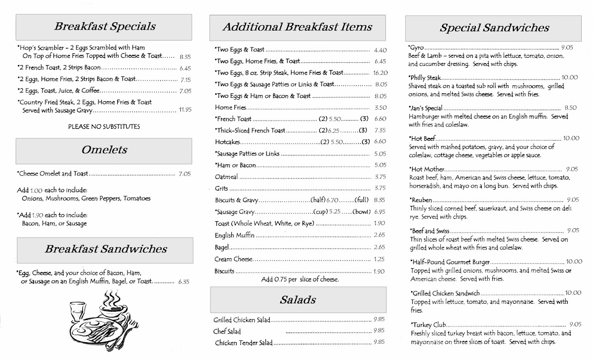 Breakfast items like country fried steak paired with eggs, home fries, and toast provide a classic start to the day, while lighter options such as scrambled eggs or oatmeal fit well for a calm morning. For midday or afternoon meals, sandwiches including a double cheeseburger or grilled ham and cheese come with sides like fries or chips, making them easy and satisfying casual bites.