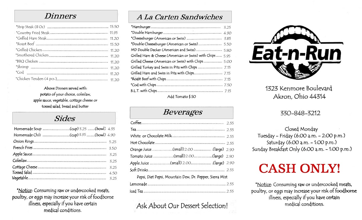 The menu at Eat N Run reflects a straightforward, comforting café style—familiar American dishes served in generous portions meant to satisfy any appetite. Whether you’re stopping by early for a hearty breakfast or dropping in later for a casual lunch, there’s a sense of relaxed simplicity in every offering.